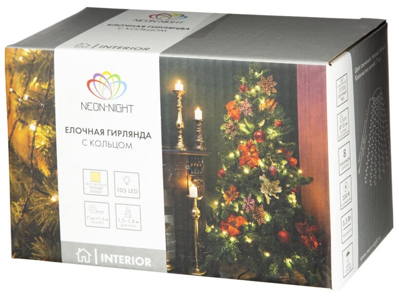 Гирлянда NEON-NIGHT елочная с кольцом, 235-076, 7 нитей, 1 шт. в наборе, 1.5 м, 105 ламп, белый