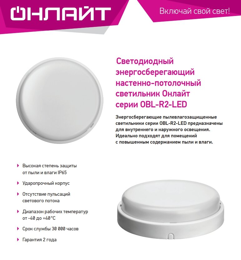 Светильник светодиодный LED Онлайт OBL-R2, 12W, 6500 К, IP65, белый