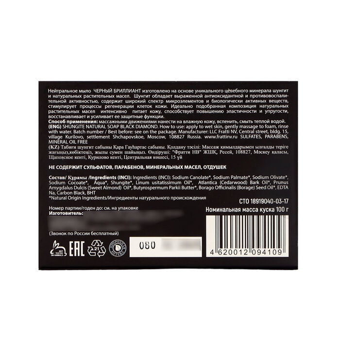 Натуральное шунгитовое мыло шунгит Черный бриллиант, нейтральное, 100 г
