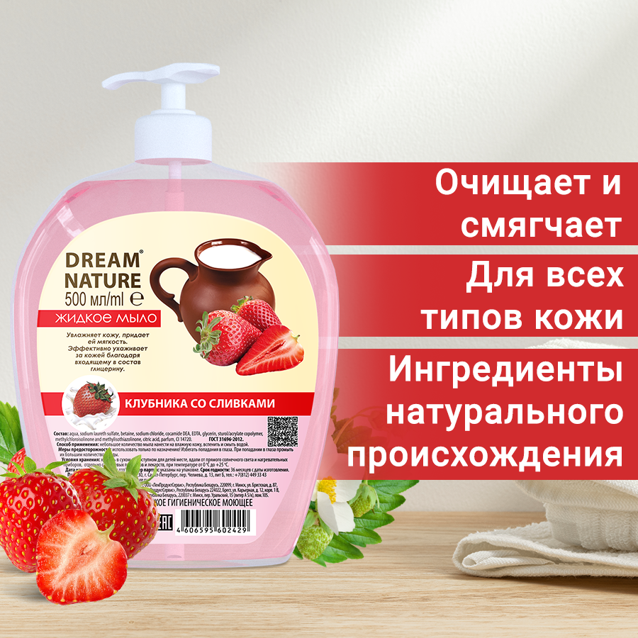 Купить Жидкое мыло для рук Dream Nature "клубника со сливками", 500мл