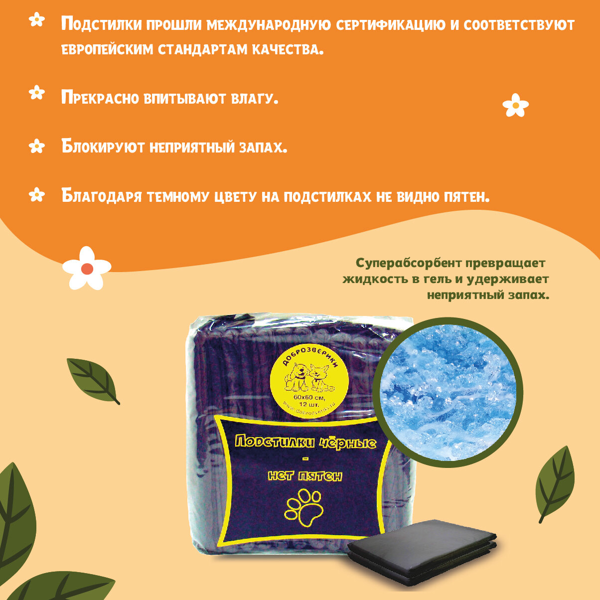 Пелигрин Доброзверики подстилки впитывающие для животных Черные с суперабсорбентом, 60х60см 12шт