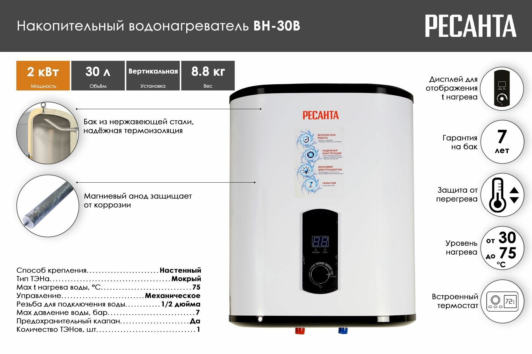 Водонагреватель Ресанта ВН-30В 74/5/1 /2000Вт, вертикальный, 30л, диспл./