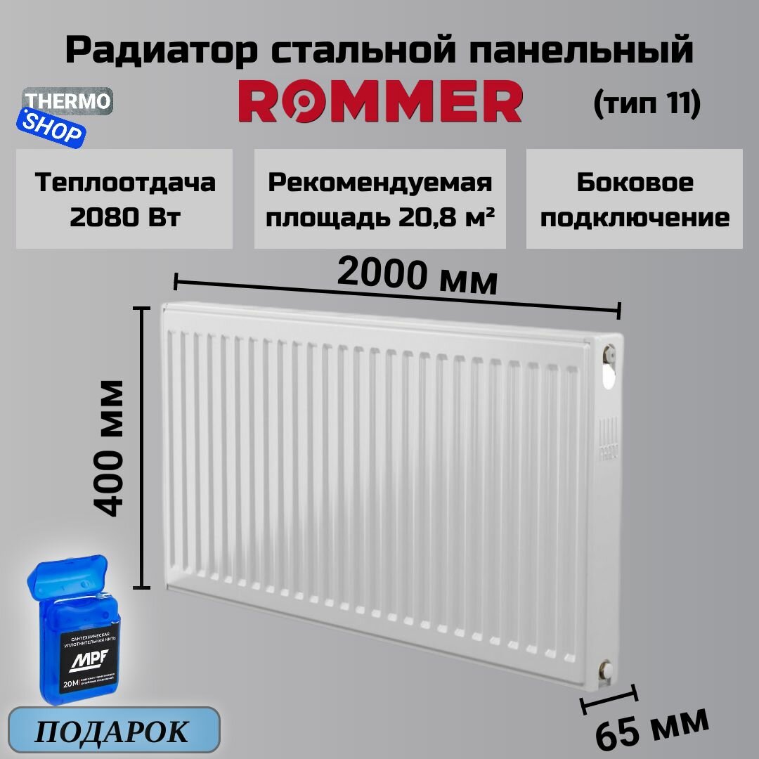 Радиатор стальной панельный 400х2000 боковое подключение Compact 11/400/2000 Сантехническая нить 20 м