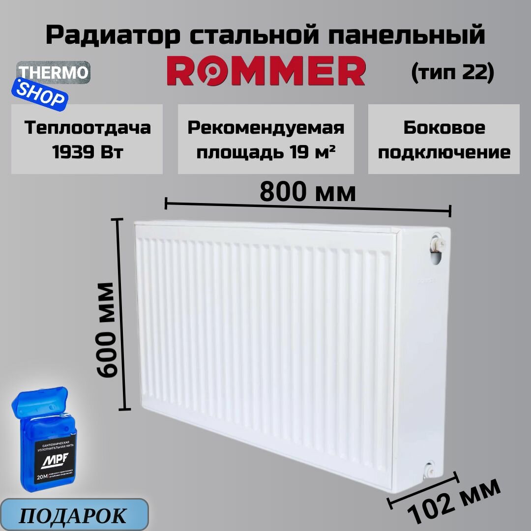 Радиатор стальной панельный ROMMER 600х800 боковое подключение Compact 22/600/800 Нить сантехническая