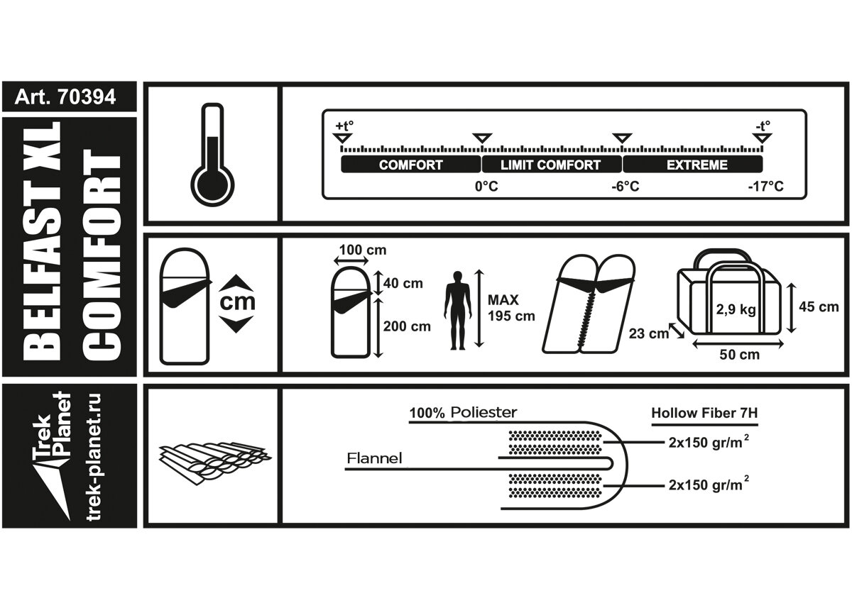 СохранитьСпальный мешок TREK PLANET Belfast XL Comfort, широкий с фланелью, левая молния, цвет: синий интересное: