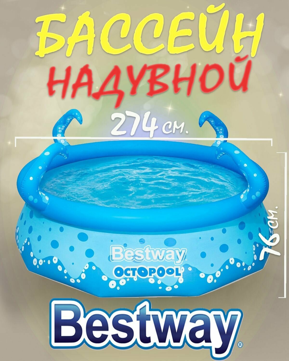 Ниже Вы можете прочитать отзывы на Бассейн Bestway Осьминог 57397, 274х76 см, 274х76 см, ознакомится с подробными характеристиками, посмотреть интересные обзоры и фотографии на Бассейн Bestway Осьминог 57397, 274х76 см, 274х76 см.