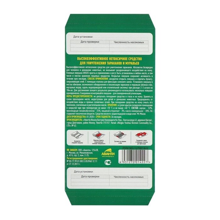 Ловушка ARGUS Prof клеевая от тараканов и муравьев AR-422, 10 шт., зелeный