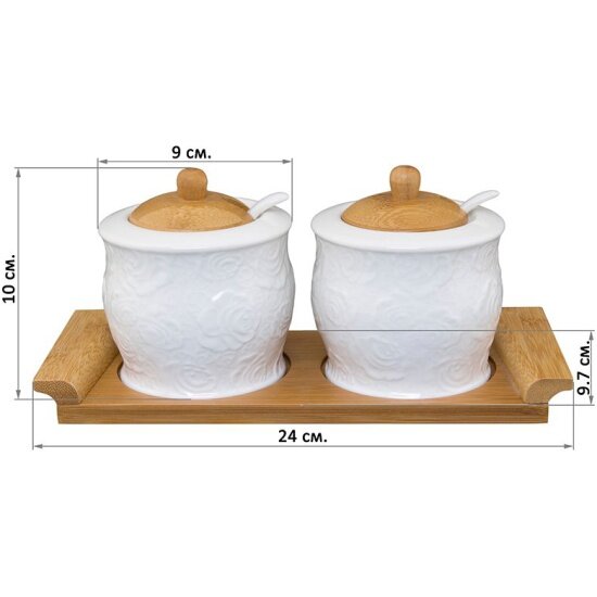 Набор 2 банок д/хранения 300 мл 24х9,7х10 см "Белые розы" с дер. крышкой на дер. подставке + 2 ложки