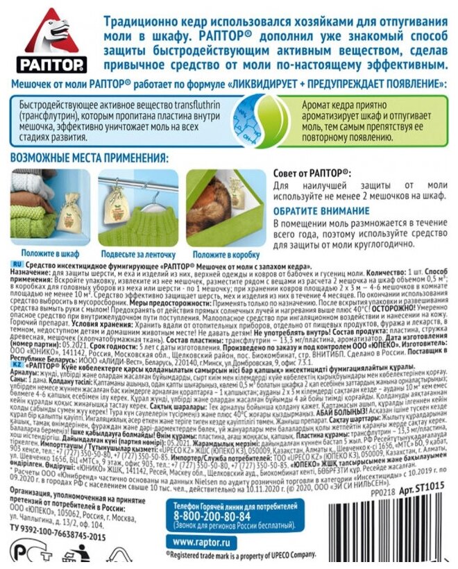 Раптор Мешочек от моли "Раптор", с запахом кедра, 1 шт