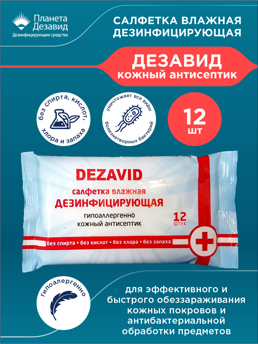 Влажные дезинфицирующие салфетки "Дезавид", 12 шт/упак