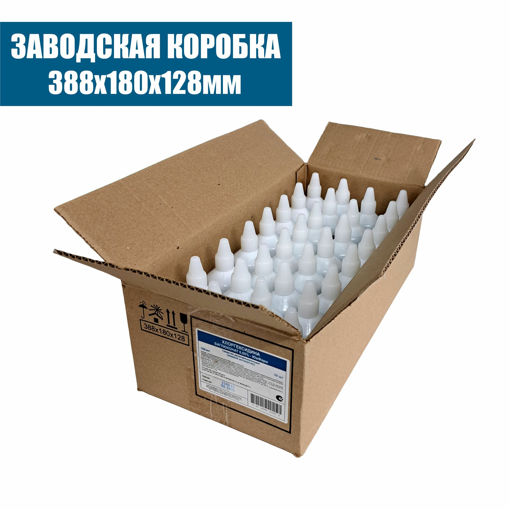 Комплектация 32 шт. Антисептик для рук и поверхностей Хлоргексидин водный раствор 0,05%, пластиковый флакон, 100 мл, Южфарм