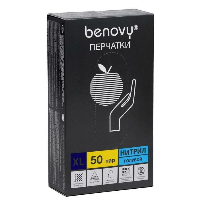 Перчатки гигиенические Benovy (100 пар), L, Нитрил, голубой