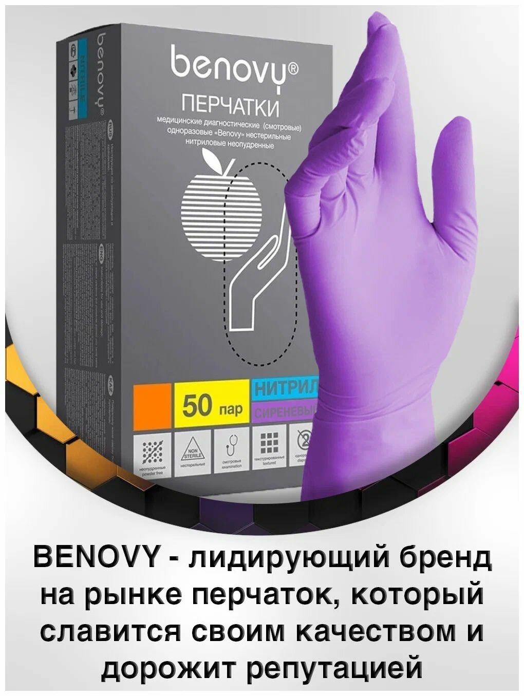 Перчатки одноразовые Benovy, нитриловые, размер L, сиреневые, 50 пар