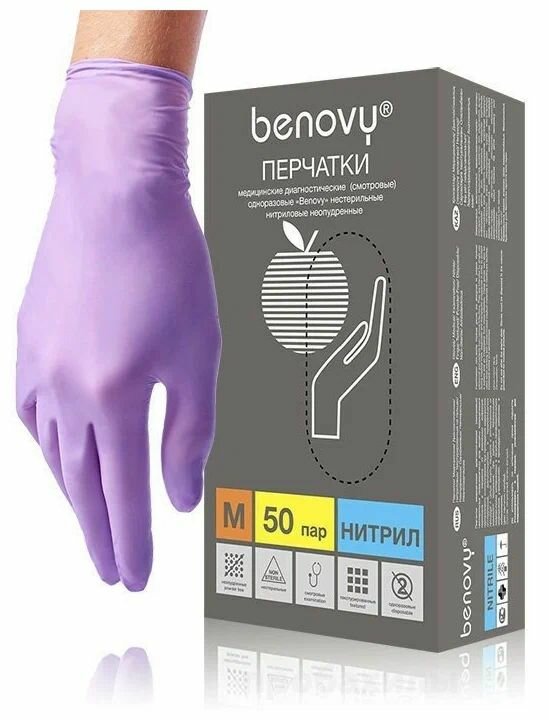 Перчатки медицинские Benovy, нитриловые, неопудренные, нестерильные, размер M, 50 пар, сиреневые