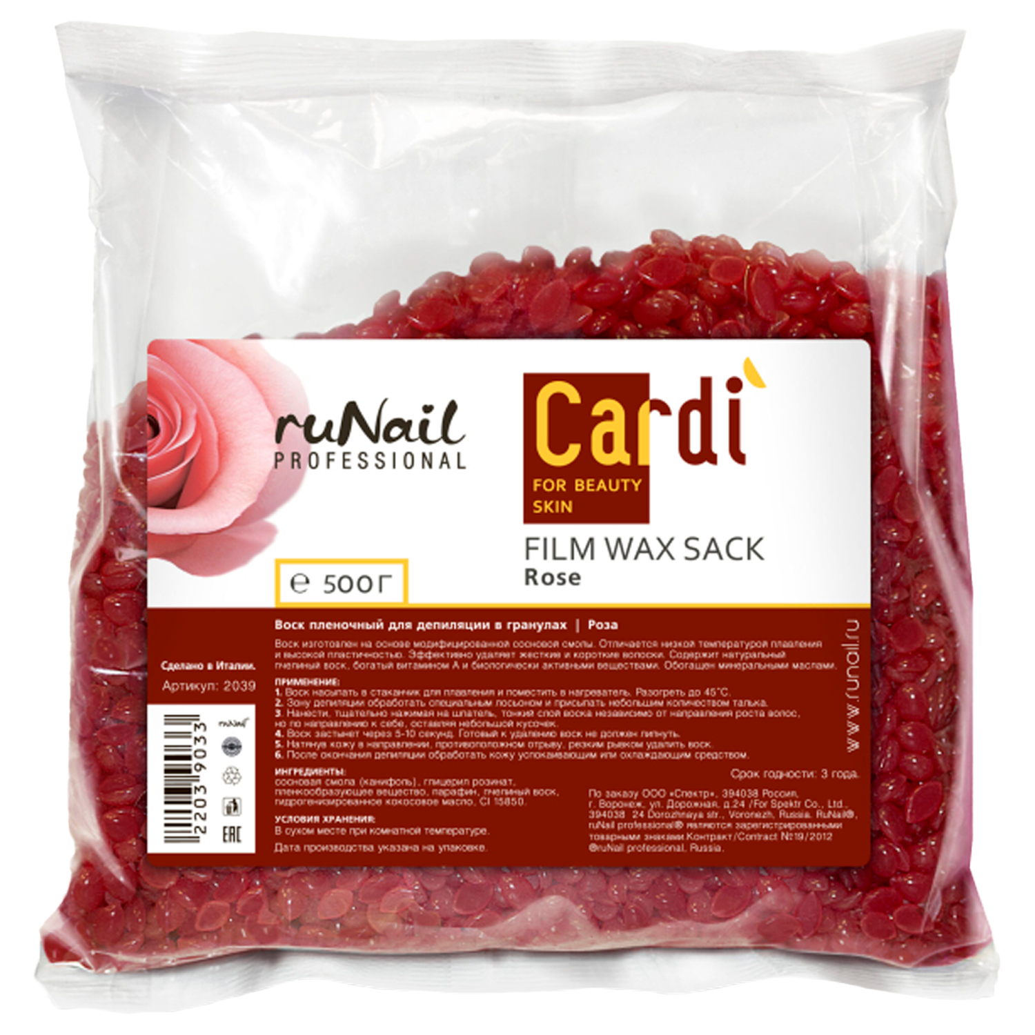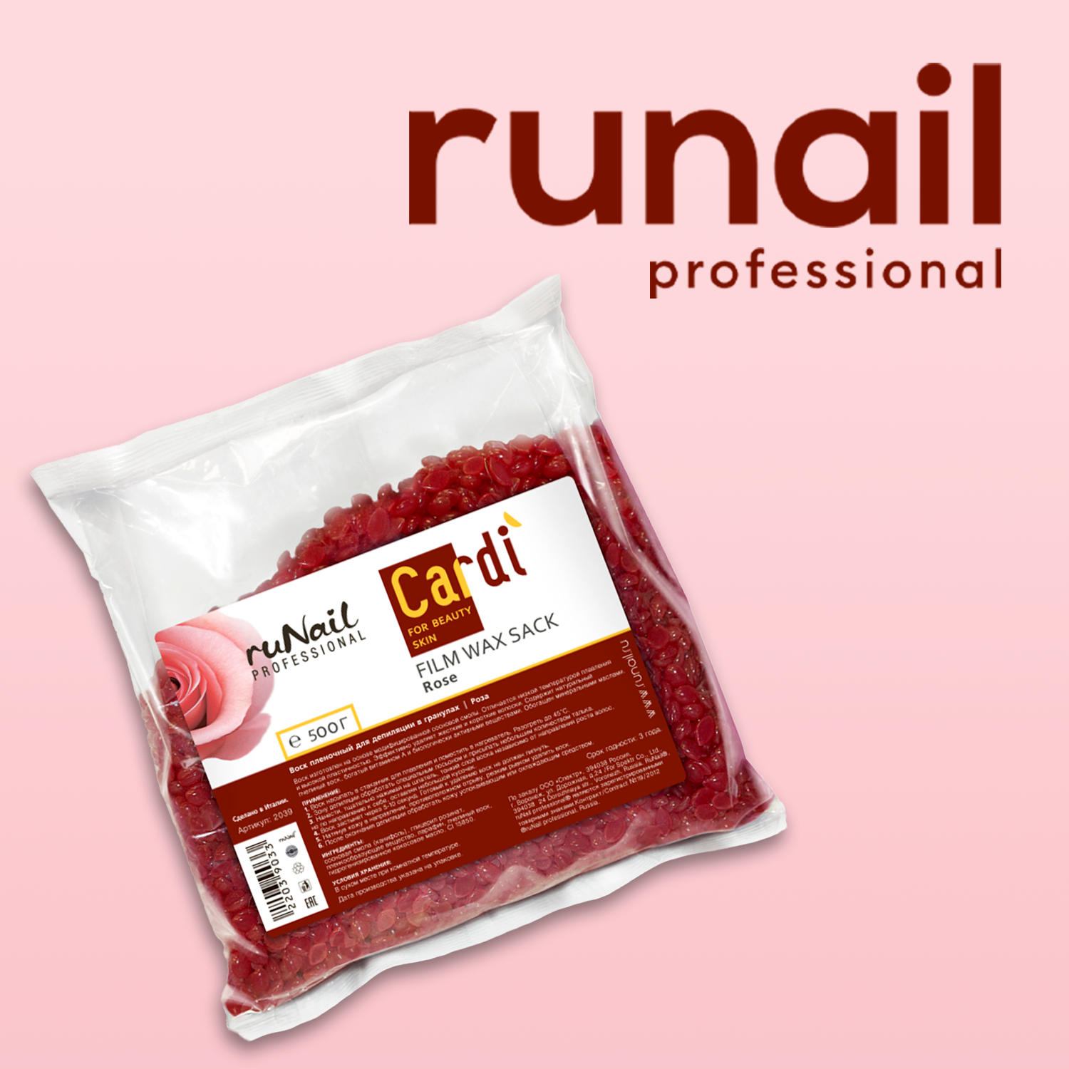 RUNAIL, CARDI, Воск пленочный для депиляции в гранулах, Роскошная роза, 500 г