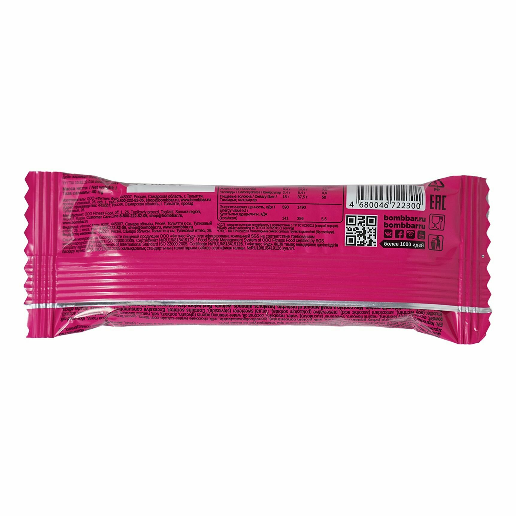 Bombbar, Протеиновый батончик в шоколаде, упаковка 30шт по 40г (малиновый сорбет)