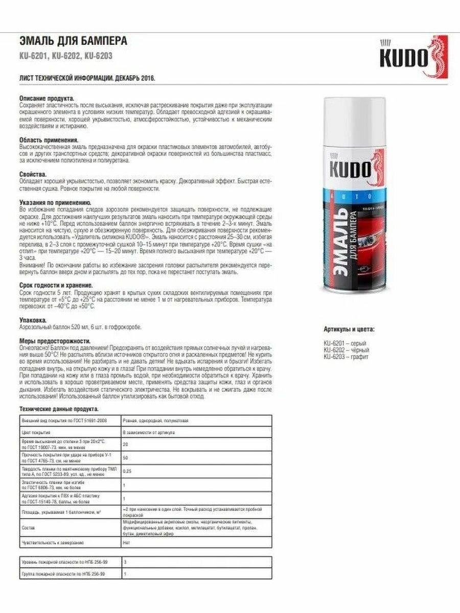 Эмаль Для Бампера Серая Мл Kudo Ku-6201 Kudo арт. KU6201