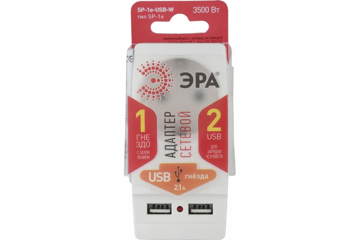 ЭРА разветвитель 1 роз. 16А + 2 USB 2000mA белый, земля SP-1e-USB-W lБ0026332