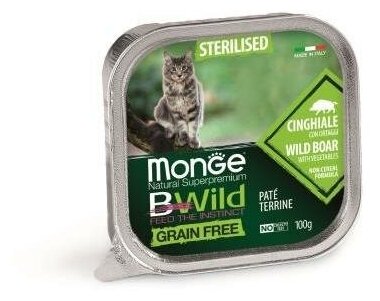 Влажный корм для стерилизованных кошек Monge Cat BWILD Grain Free Sterilised CINGHIALE con ORTAGGI, беззерновой, кабан, овощи, 32 шт. х100г (паштет)
