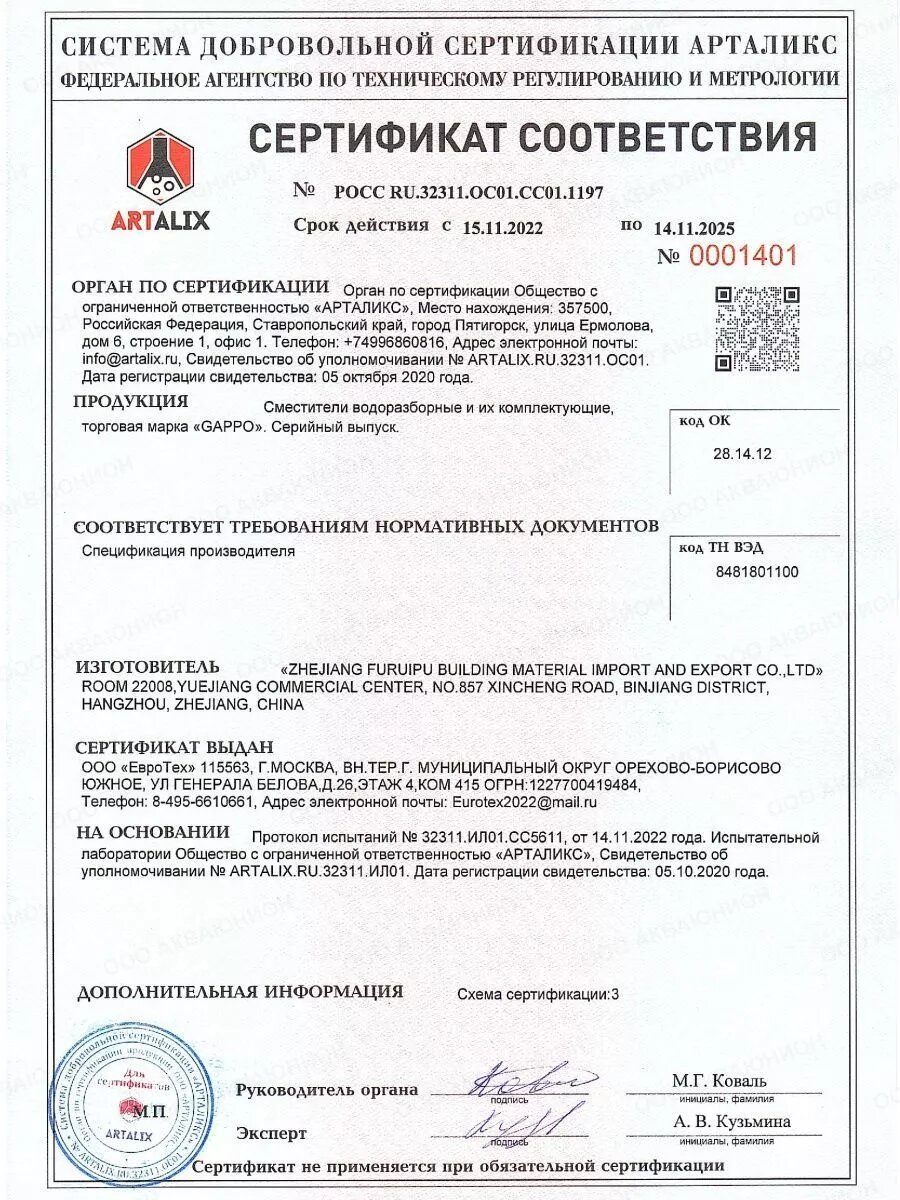 | Запорный клапан | керамический картридж |