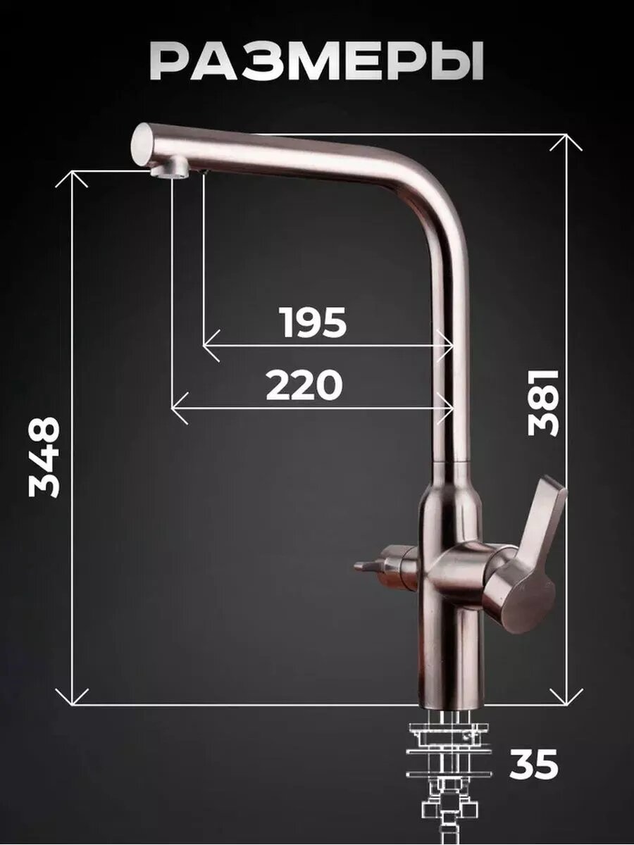 | Плюсы: | Почти идеален для кухни. Размеры, длина носика, канал для фильтрованной воды. |