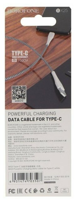 USB кабель BOROFONE BX25 Powerful Type-C, 1м, 3A, нейлон (белый)
