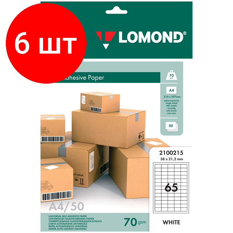 Купить Комплект 6 шт, Бумага самоклеящаяся А4 50л. Lomond, белая, 65 фр. (38*21.2), 70г/м2