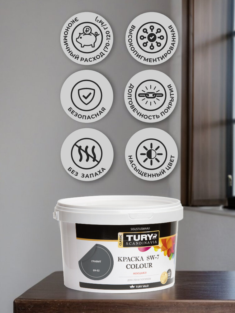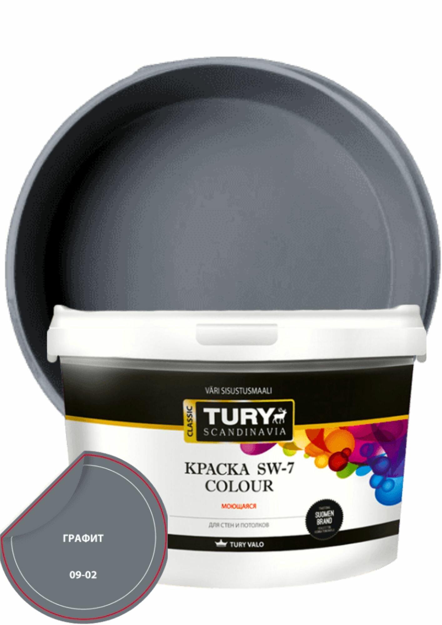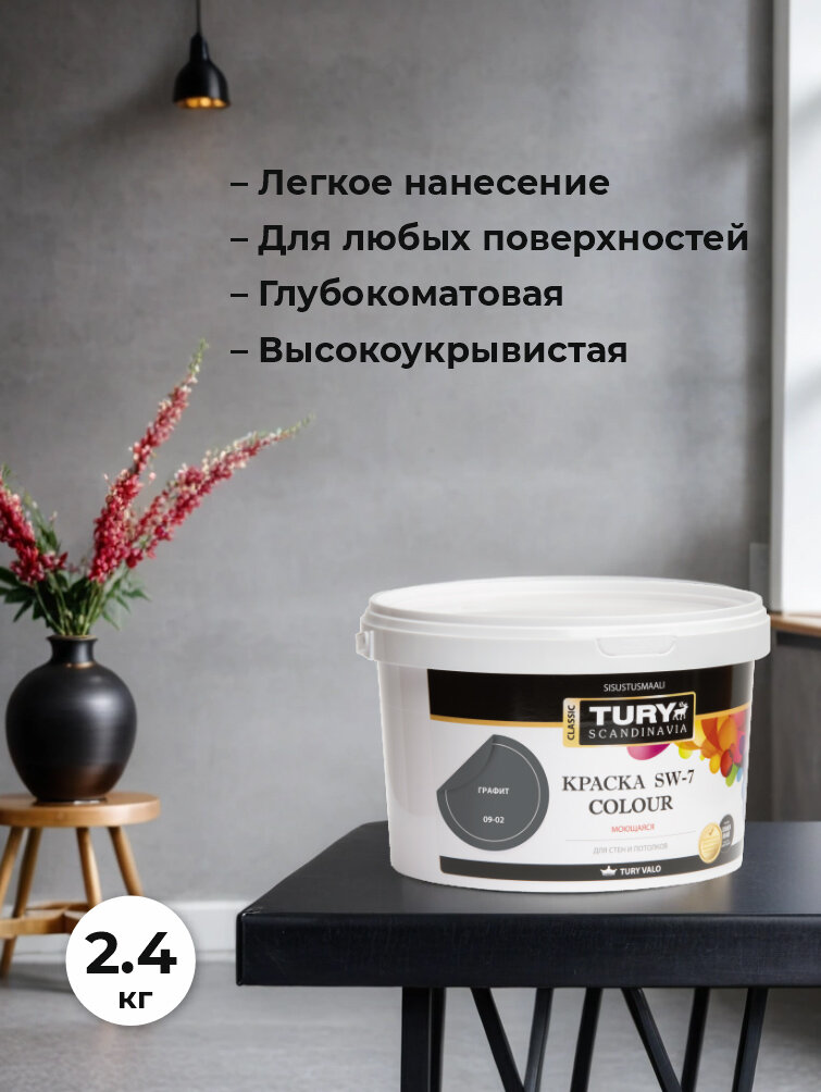Краска для обоев и стен моющаяся TURY SW-7 Colour матовая, без запаха, цвет Графит, 2.4 кг