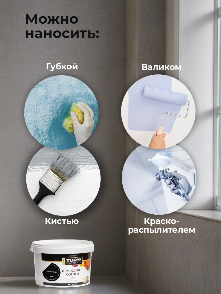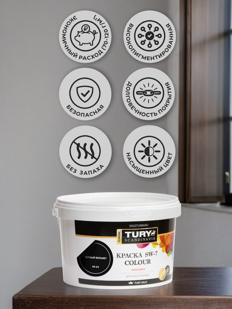 Краска для обоев и стен TURY SW-7 Colour моющаяся черная матовая, без запаха, 2.4 кг