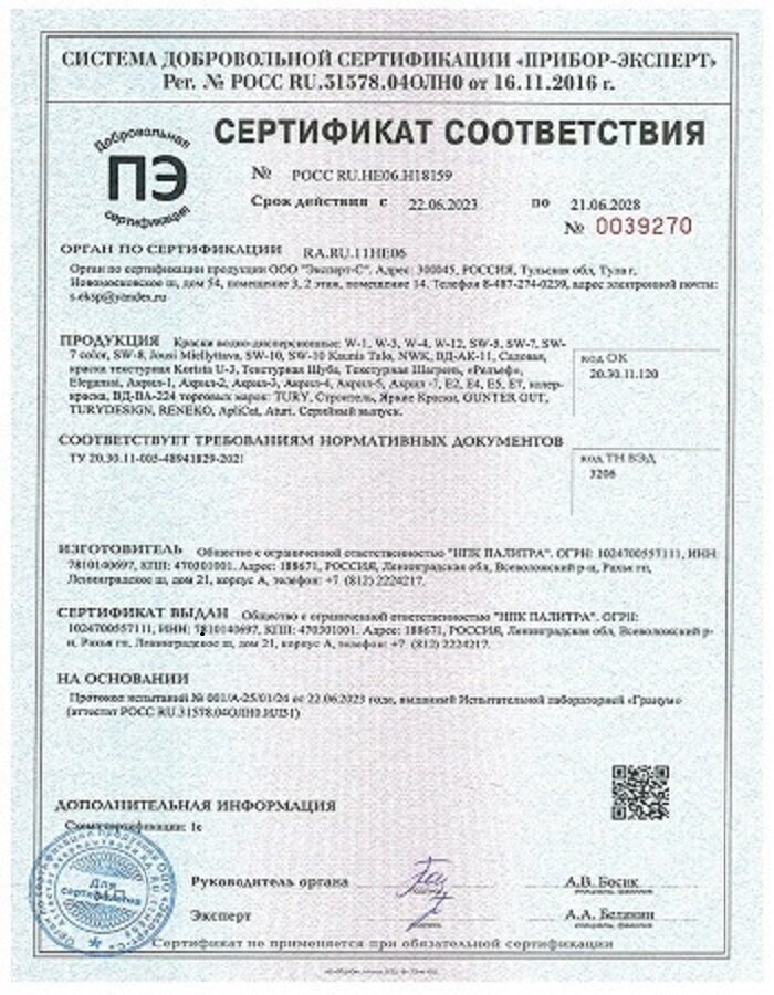 Краска акриловая TURY SW-7 Colour для стен и потолков моющаяся 0,4кг крем-брюле, арт.КрВДSW70,4КБ