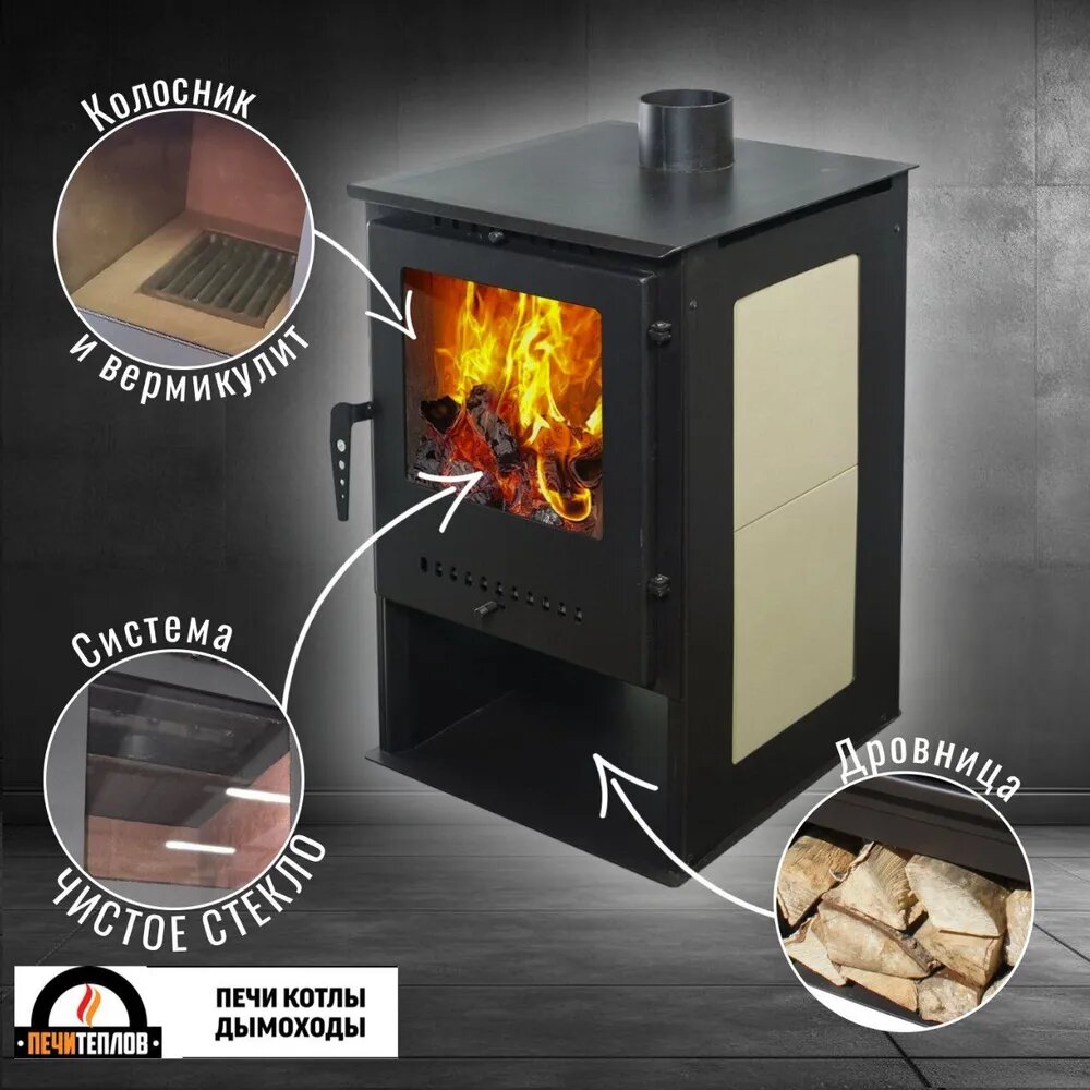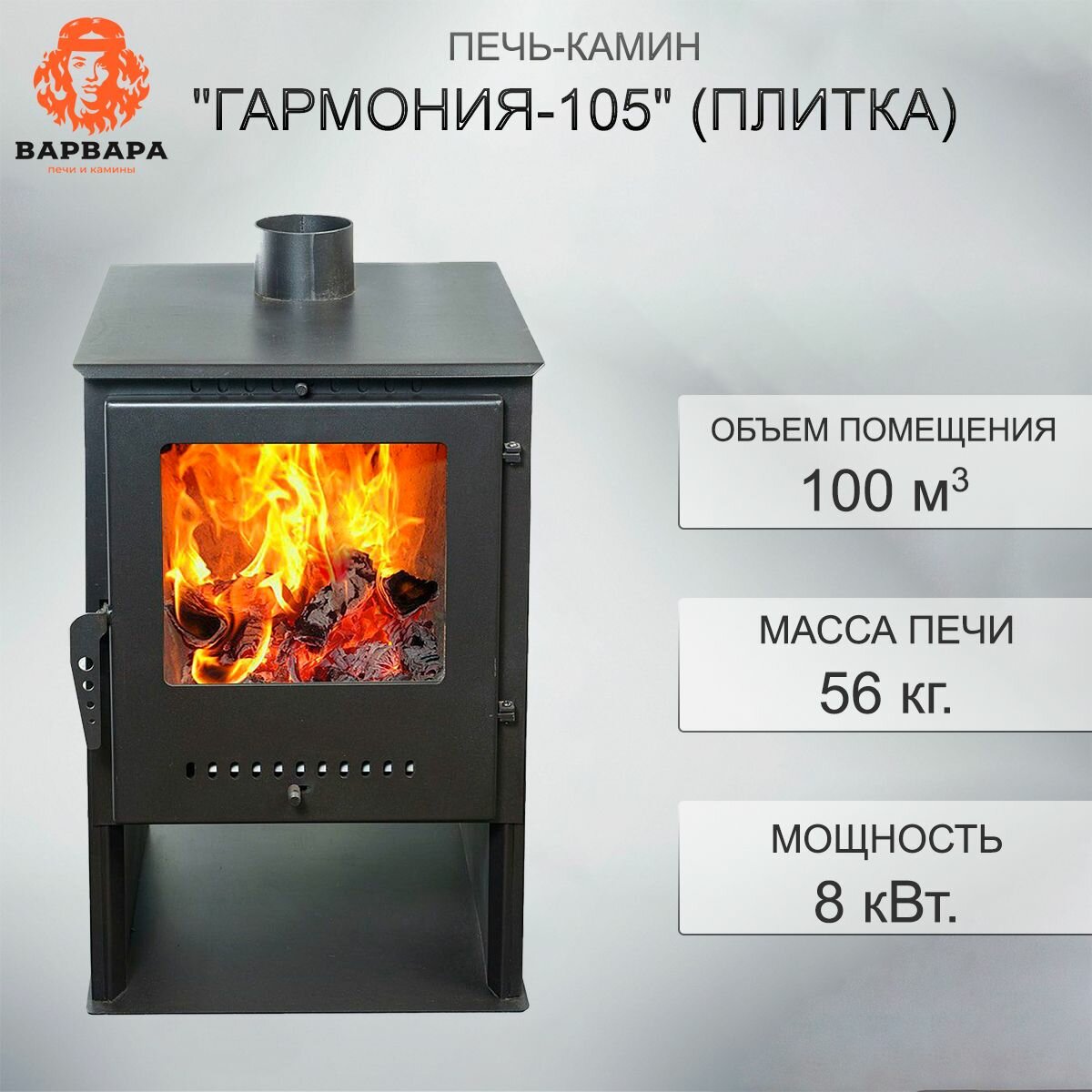 Печь -камин дровяная отопительная Варвара " гармония 105 (Черный)" для дома и дачи, 9 кВт, 100 куб. м