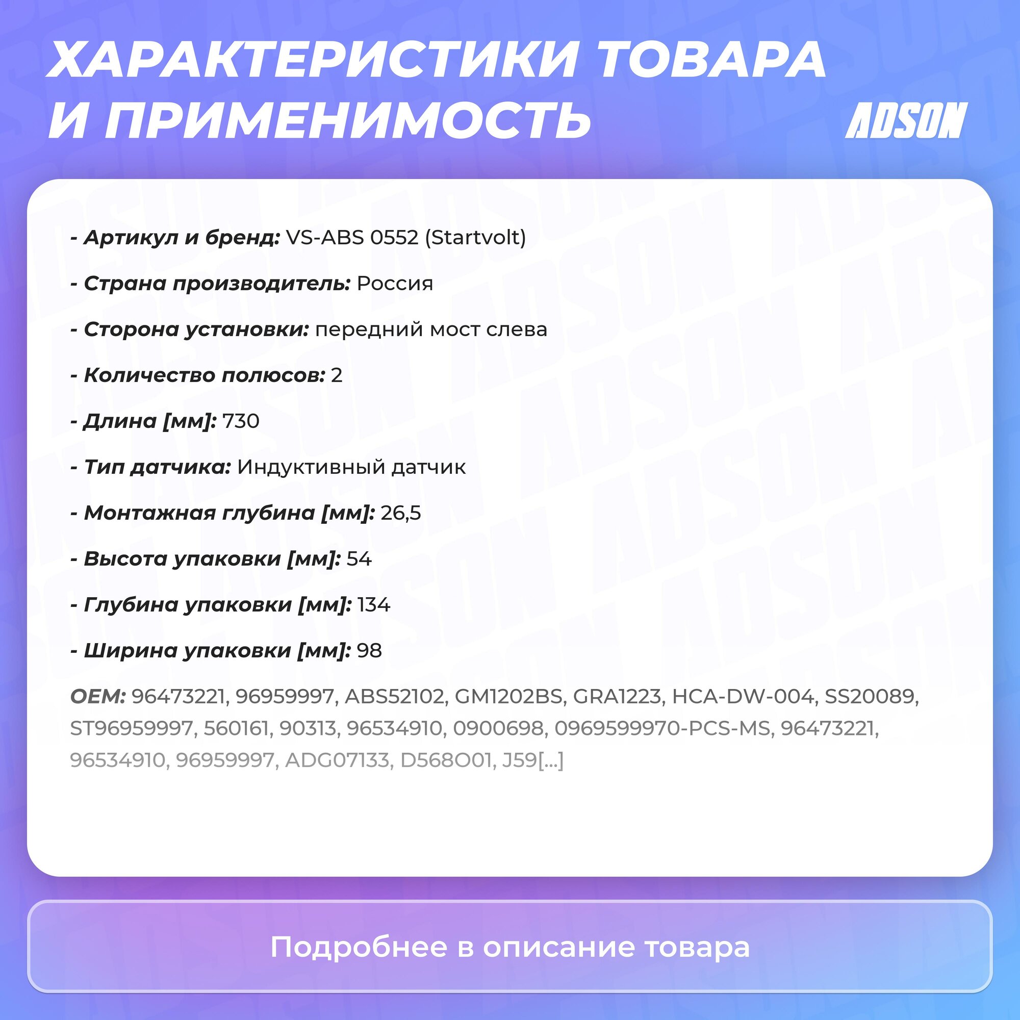 Датчик Abs Передний L Vsabs 0552 Startvolt Vs-Abs 0552 STARTVOLT арт. VS-ABS 0552