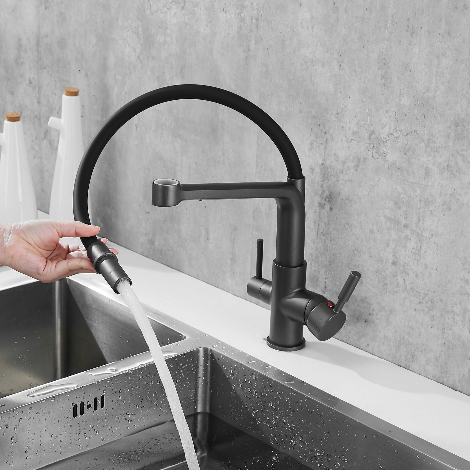 Смеситель для кухни с гибким изливом Rose R658Y темно-серый/черный