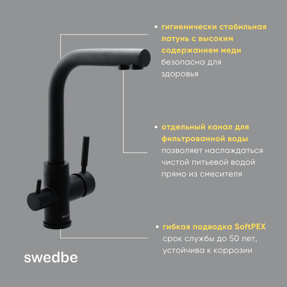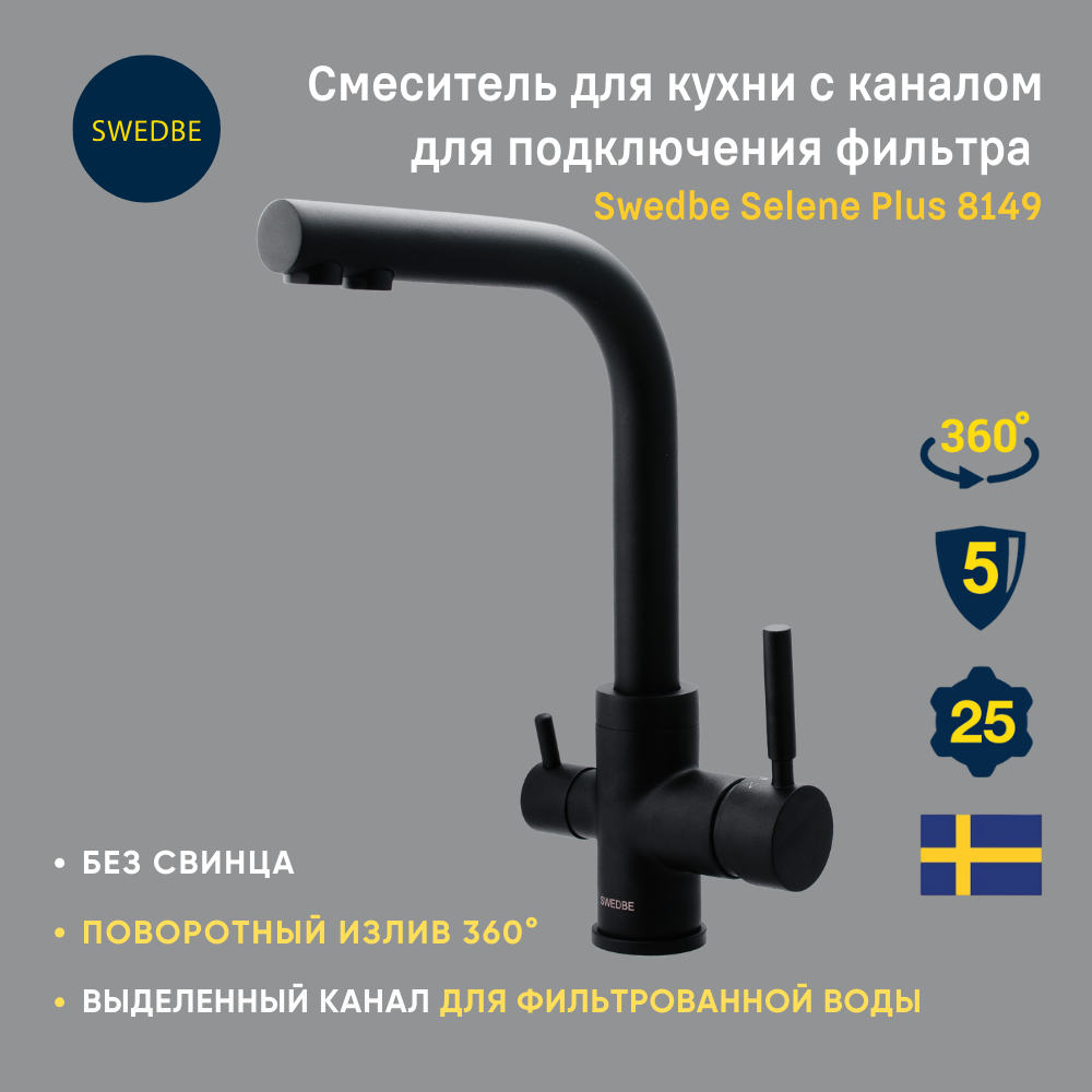 Смеситель Swedbe Selene Plus 8149 для кухни, с каналом для подключения фильтра, черный/сатин