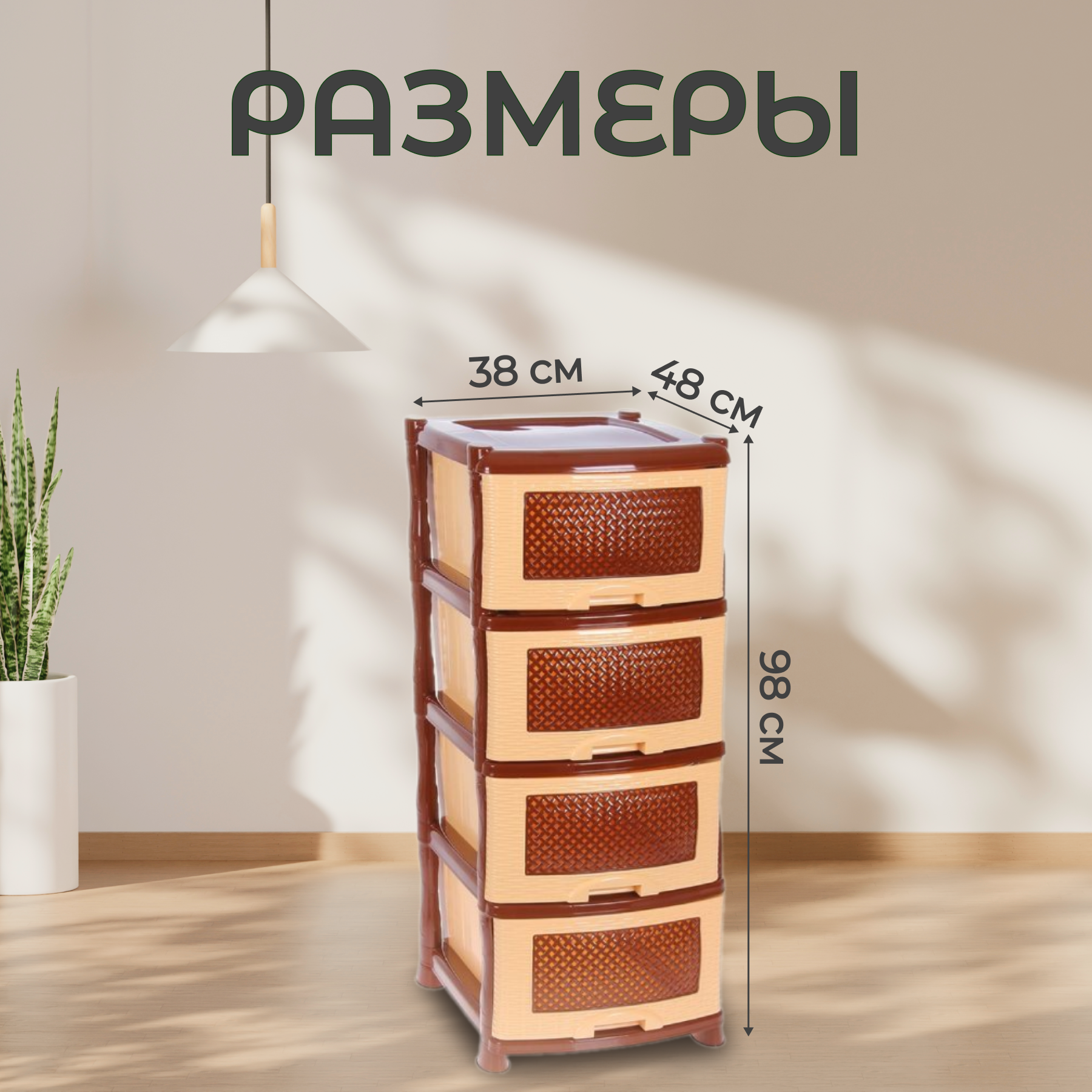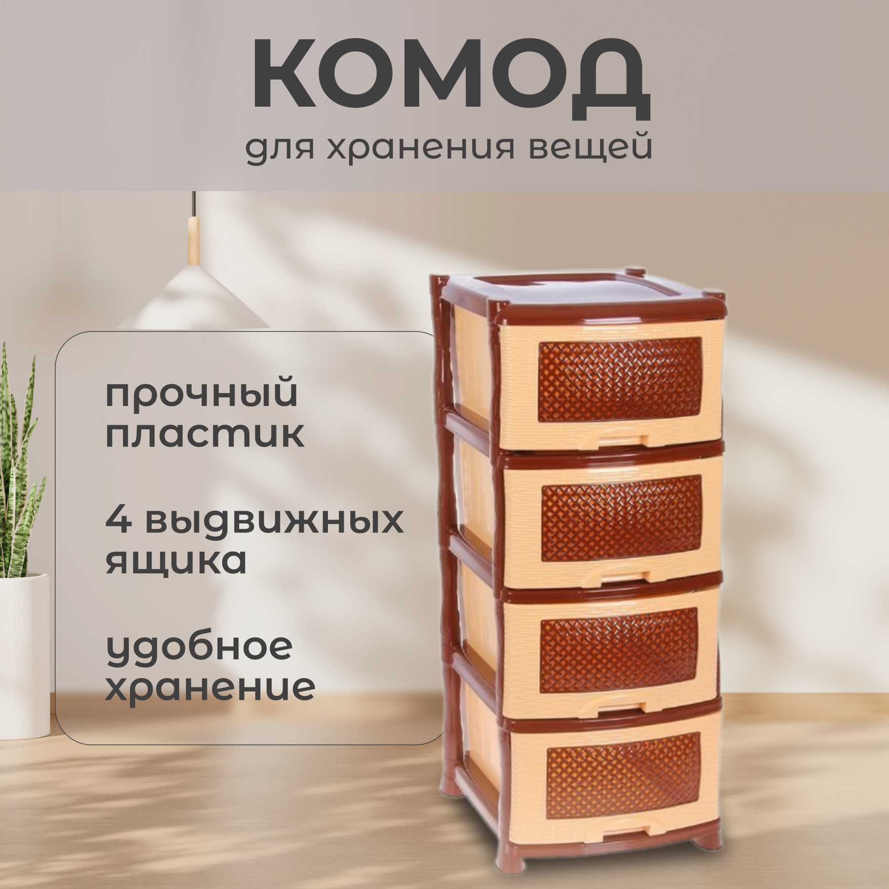 Комод пластиковый Плетёнка с 4 ящиками / универсальный стеллаж для хранения вещей / органайзер для аксессуаров, цвет коричневый