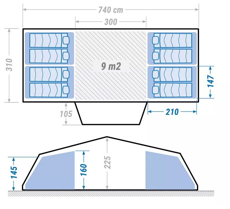 | Размеры внешней палатки (ДхШхВ) | 740x310x225 см |