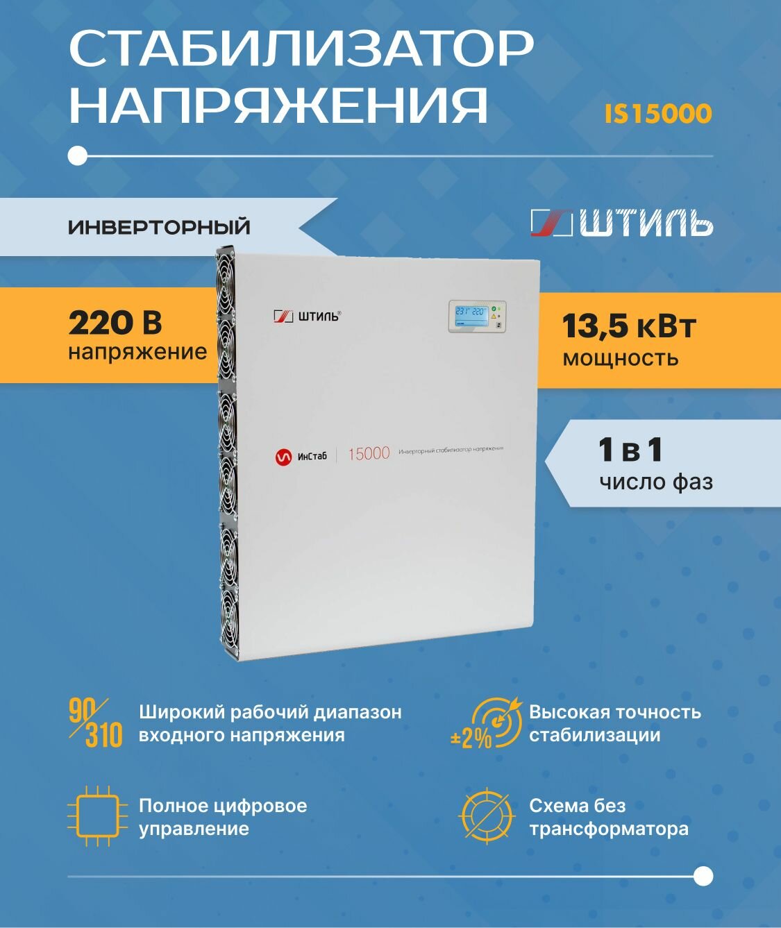 Инвенторный стабилизатор напряжения Штиль IS15000 ИнСтаб/15000ВА/13,5 кВт/Стабилизатор Штиль однофазный/Стабилизатор напряжения 220В.