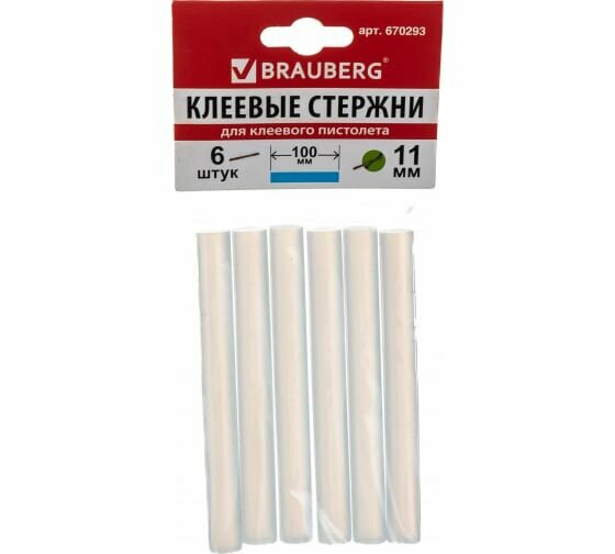 Клеевые стержни, диаметр 11 мм, длина 100 мм, белые, комплект 6 штук, BRAUBERG, европодвес, 670298 (арт. 670298)