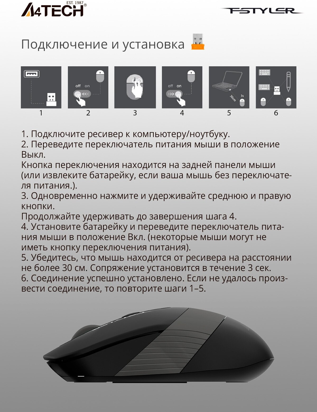 Купить A-4Tech Мышь Fstyler FG10S черный/серый оптическая (2000dpi) беспроводная USB (1204030)