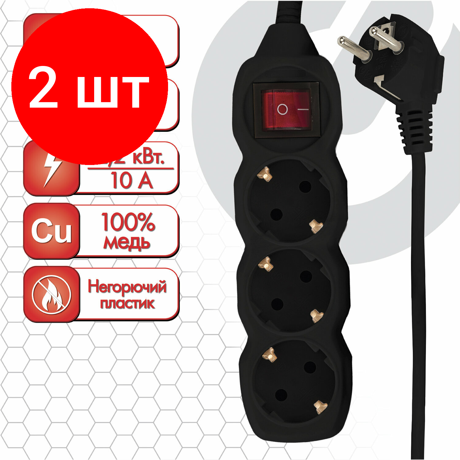 Удлинитель сетевой SONNEN U-133GS 3 розетки c заземлением выключатель 10 А 3 м черный, 2 шт