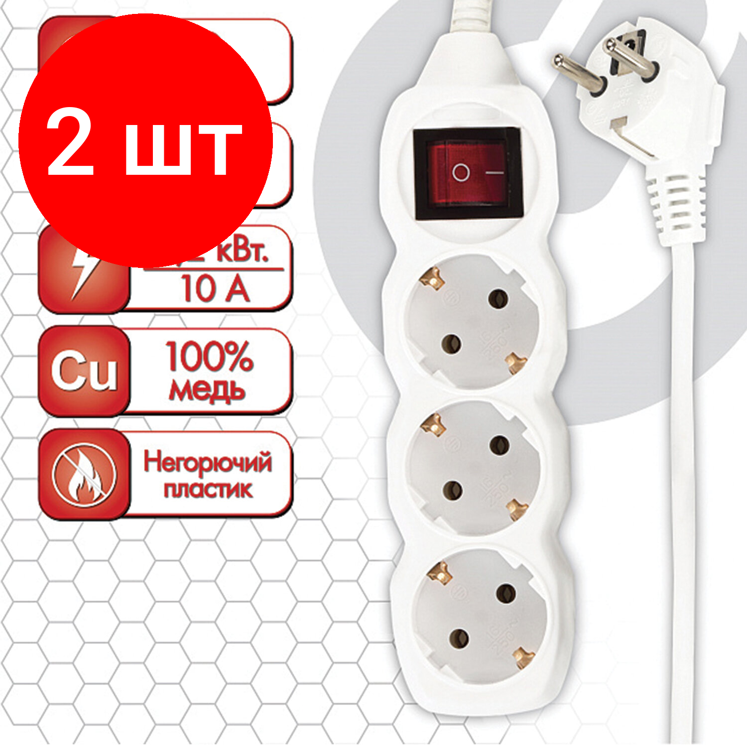 Купить Комплект 2 шт, Удлинитель сетевой SONNEN U-133GS, 3 розетки, c заземлением, выключатель, 10 А, 3 м, белый, 511434