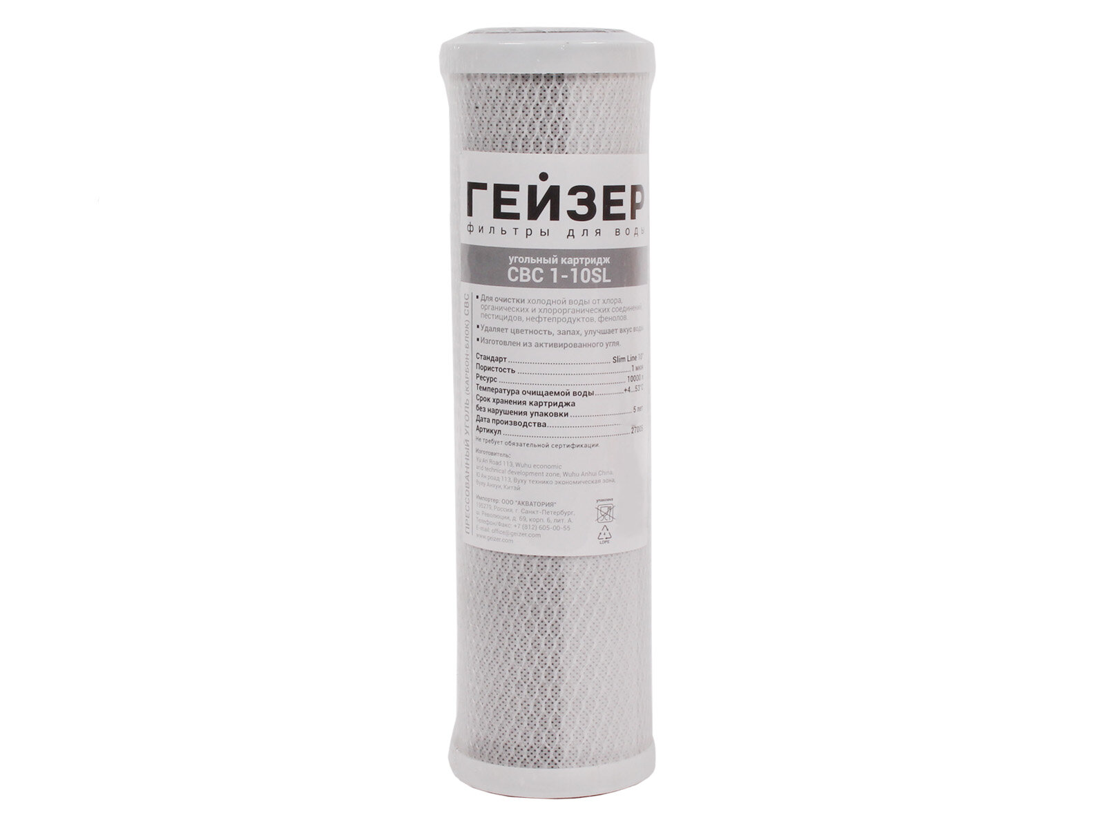 Угольный картридж Гейзер CBC 1 - 10 SL, для кондиционирования воды и удаления мелких нерастворимых примесей, 27005