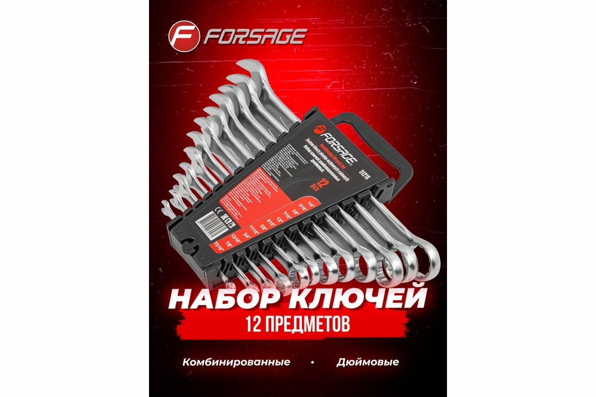 Набор ключей комбинированных дюймовых 12 пр.(1/4,5/16,3/8,7/16,1/2,9/16,5/8,11/16,3/4,13/16,7/8,15/16")в пластиковом держателе Forsage F-5121S