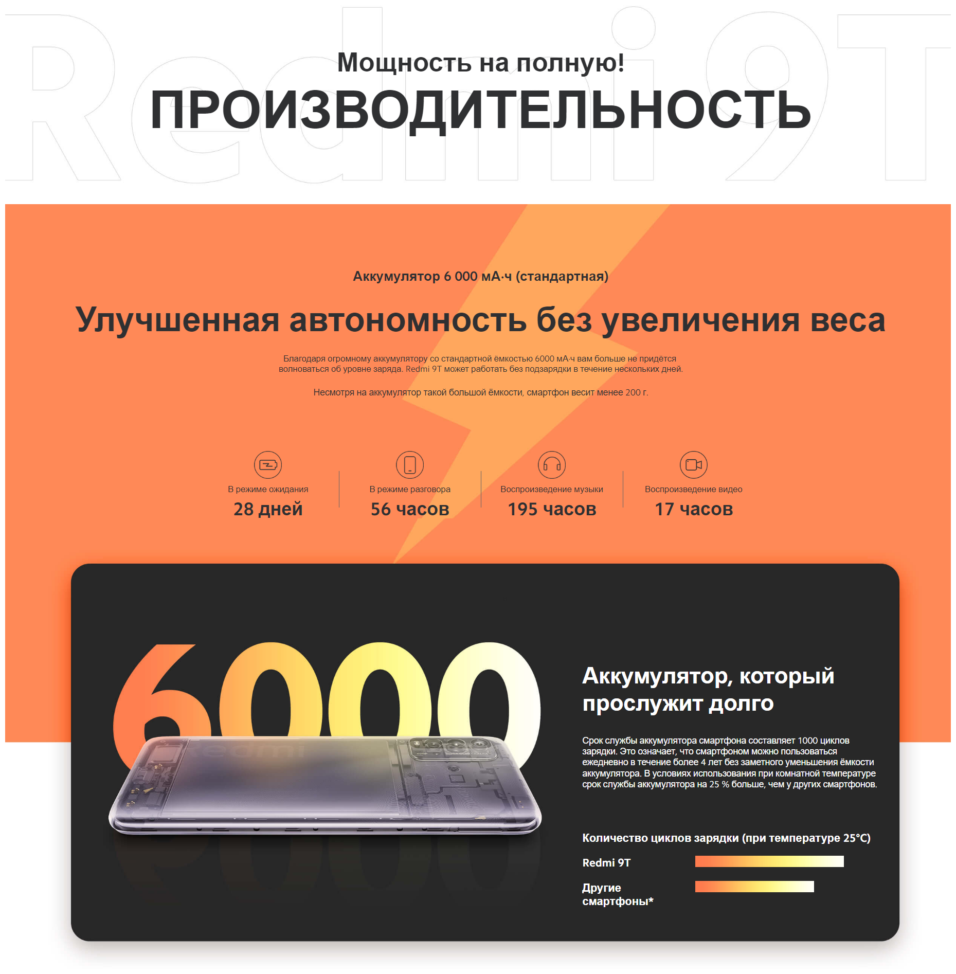 Смартфон Xiaomi Redmi 9T 8 ГБ 128 ГБ, 6000 мАч, серый карбон
