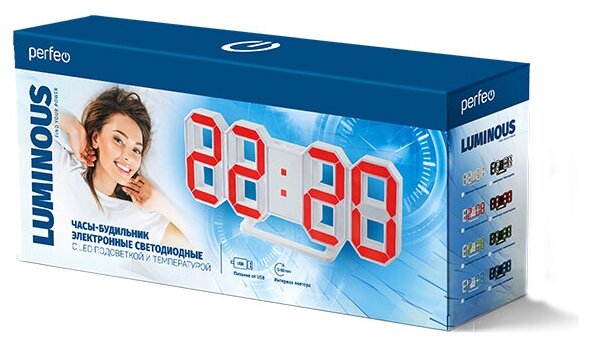Часы настольные Perfeo Luminous PF-663 белый/красный 0.35 кг 9.8 см 23.5 см светлый 6 см
