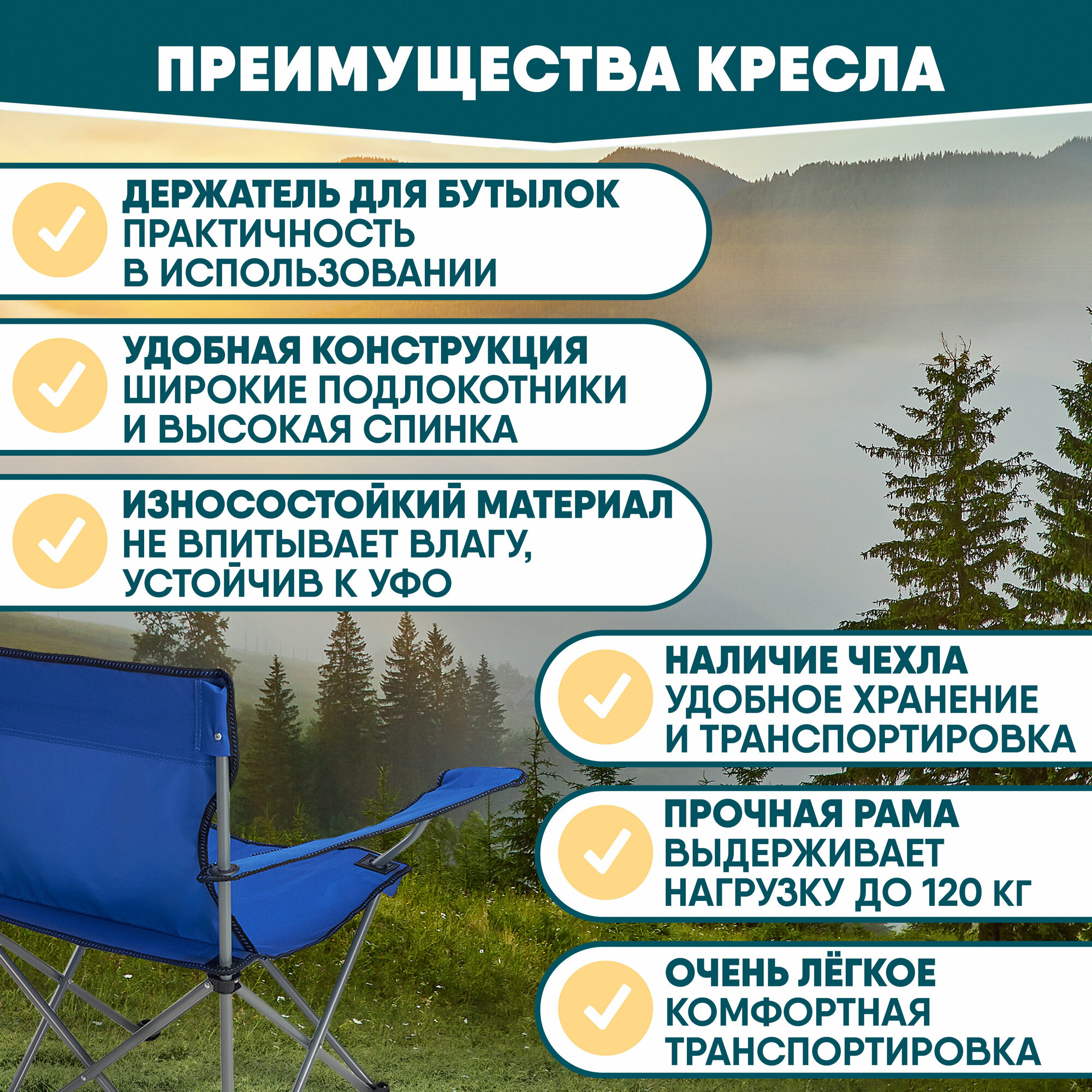 | Плюсы: | Раскладное легкое походное кресло стандартной конструкции. Весит около 2,5 кг. В удобном чехле с ремнем для носки на плече. Достаточно широкое, сидеть не тесно. В подлокотник вшит матерчатый держатель для кружки. |