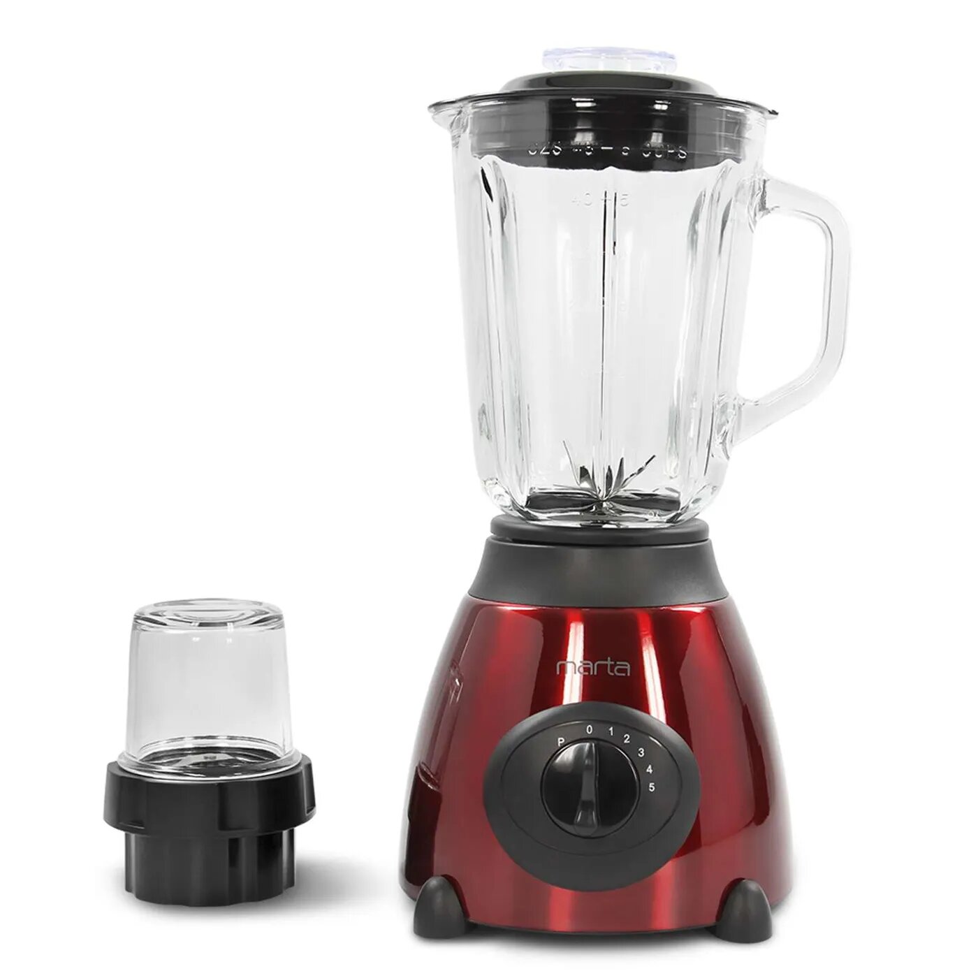 Блендер MARTA MT-1591 стационарный стекло с насадкой измельчителем 1200Вт, красный/черный