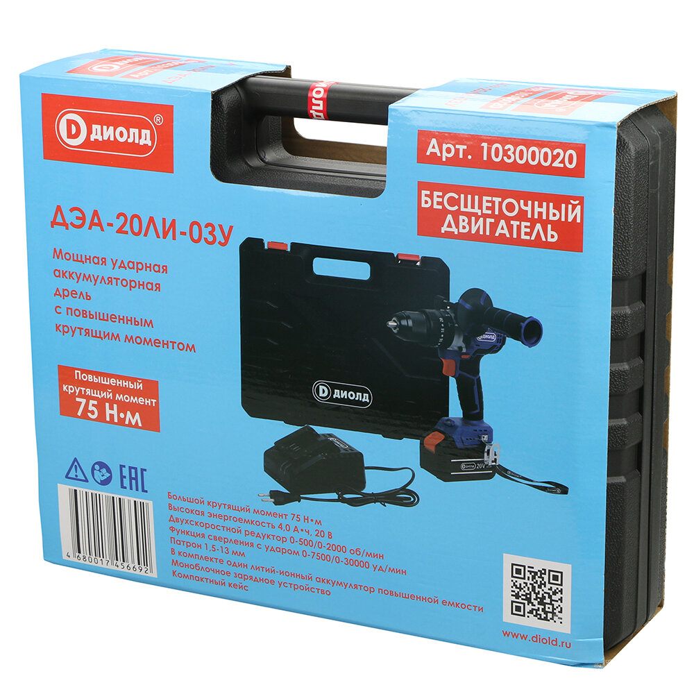 Купить Шуруповерт ударный бесщеточный диолд ДЭА-20ЛИ-03У (аккумуляторный), 20В, 75Нм, 4Ач, 0-2000 об/мин, кейс, Li-ion АКБ, 2 скорости, производитель Россия