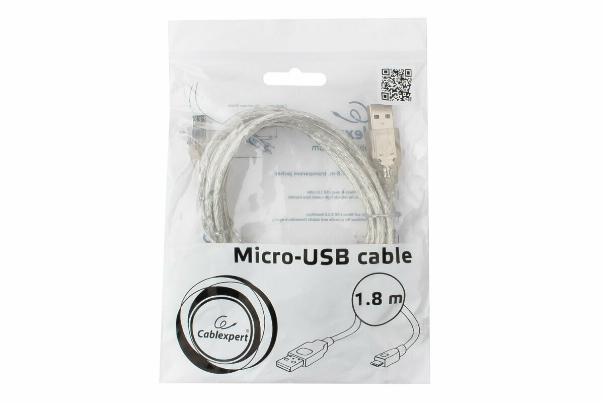Кабель USB 2.0 Pro Cablexpert CCP-mUSB2-AMBM-6-TR, AM/microBM, 1,8 м, экран, ферритовое кольцо, прозрачный