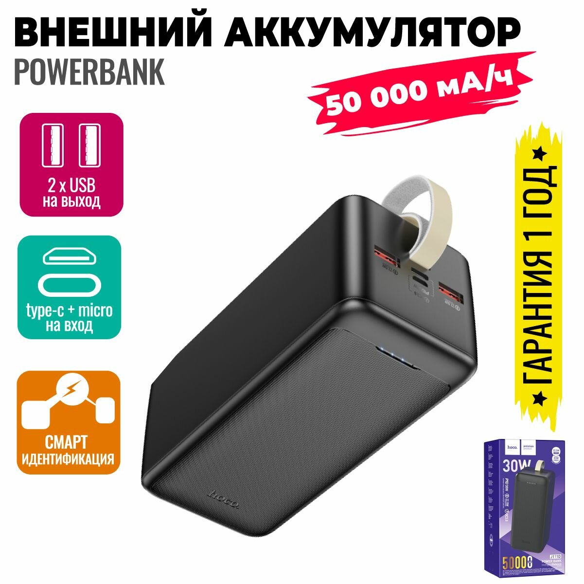 Портативный аккумулятор HOCO J111D Smart charge, 50000 мА⋅ч, черный